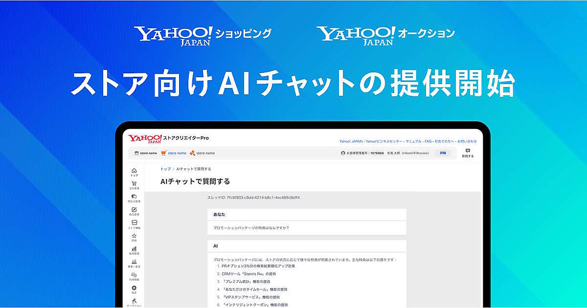 LINEヤフーは1月22日、「Yahoo!ショッピング」「Yahoo!オークション」に出店しているストアからの問い合わせに対し、生成AIを活用して回答するチャットボット「ストアクリエイターPro AIチャット」の提供を開始した。