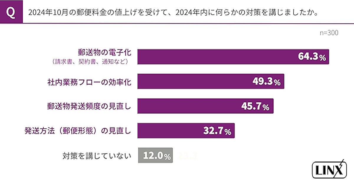 2024年10月の郵便料金値上げを受けて、2024年内に講じた対策を聞いたところ、請求書、契約書、通知など「郵送物の電子化」が64.3%と最も多く、「社内業務フローの効率化」が49.3%、「郵送物発送頻度の見直し」が45.7%で続いた。