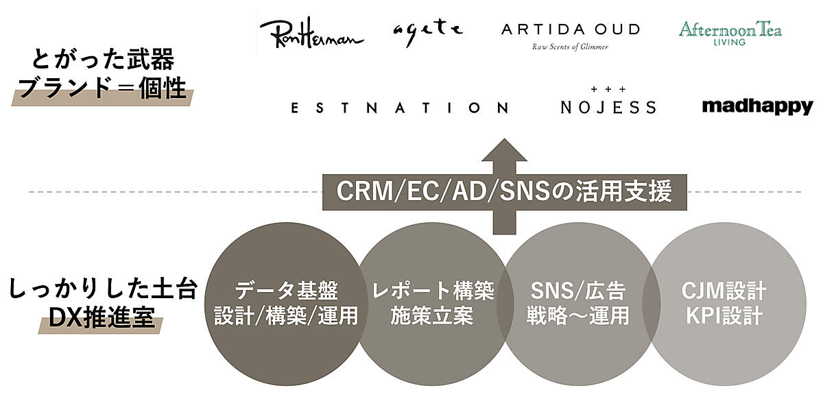 DX推進室の役割は、各ブランドの個性を支える土台となること。加藤氏は「各ブランドが考えている戦略や戦術の支援が我々の役割」と語る。具体的にはCRM、EC、広告、SNSについて、各ブランドの活用を支援する。