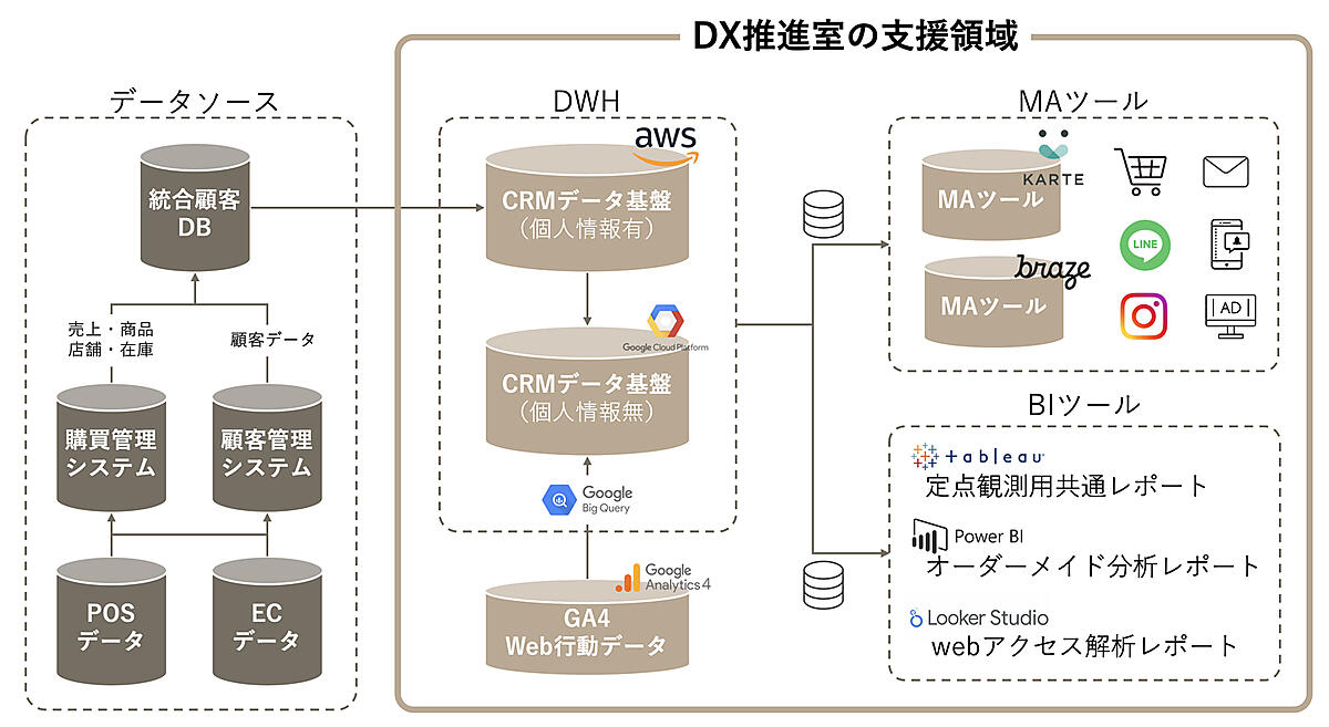 もともとCRMの基盤がまったくない状態だったため、まずは基盤の構築からスタートした。ブランドによって異なっていた顧客管理システムから情報システム部門がデータを取り出し、統合したデータベースを構築。DX推進室では、その統合データベースのデータを活用したCRMデータ基盤作りに取り組んだ。
