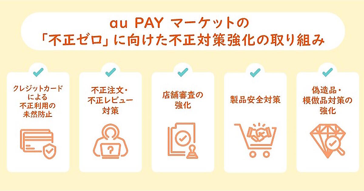 KDDIとauコマース&ライフはECモール「au PAY マーケット」において、「不正ゼロ」で安心・安全に買い物ができる売り場作りの実現に向けた5つの取り組みを進めている。クレジットカードの不正利用、不正注文・不正レビュー、偽造品・模倣品などのさまざまな不正を防ぐのが目的。