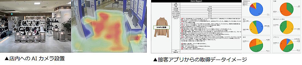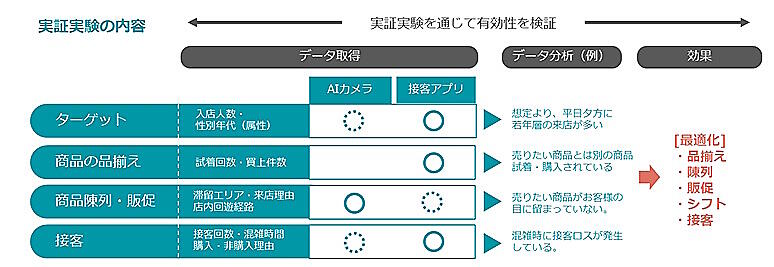 実証実験では、AIカメラから取得する来店客数・属性・混雑状況、フロアでの立ち止まりでの興味関心度合いなどの定量データと、接客アプリで収集する購入理由などの定性データを組み合わせて解析し、リアル店舗でも深い来店客インサイトを把握する。