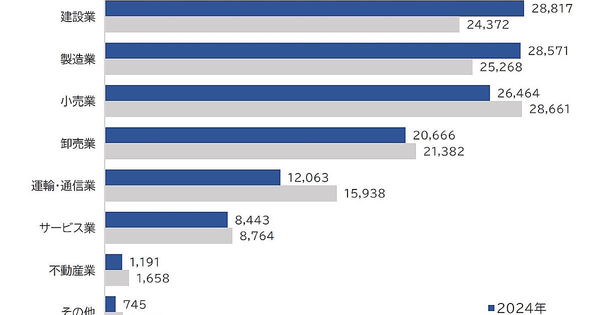 業種別に高リスクの企業数を見ると、「建設業」が2万8817社と最も多く、前年比で4445社増加した。2番目に多い業種は「製造業」の2万8571社で同3303社の増加。3番目が「小売業」の2万6464社で同2197社の減少となっている。