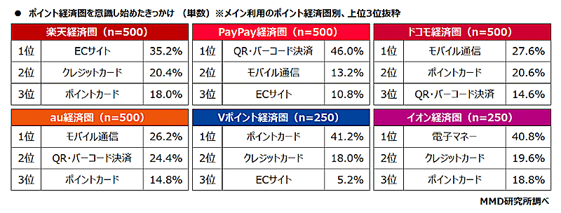 経済圏意識のきっかけ、楽天は「ECサイト」、ドコモとauは「モバイル」