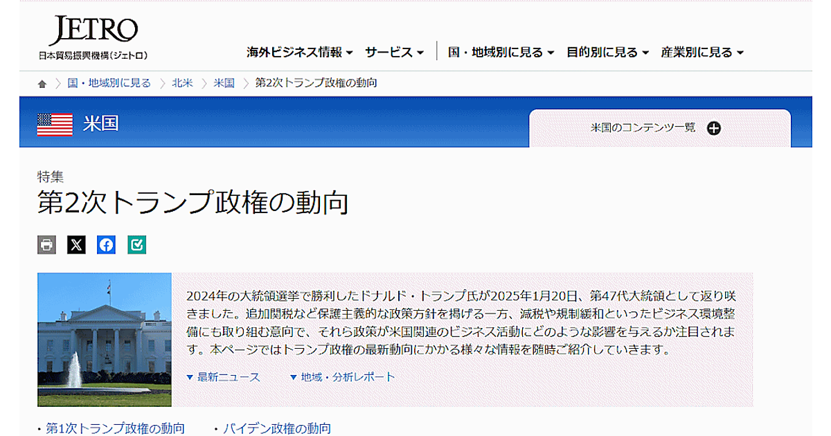 また、ジェトロのホームページの特設ページを通じたトランプ政権の動向など有益な情報も提供する。第2次トランプ政権の動向、米国・メキシコ・カナダ協定(USMCA)を取り巻く環境などのコンテンツを配信している。