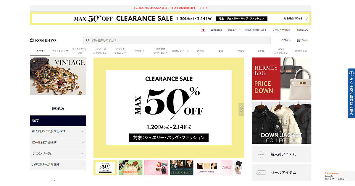 コメ兵の公式通販サイト「KOMEHYO ONLINE」は、ラグジュアリーブランドの中古品をメインに、バッグ、ジュエリー、時計、衣料品など約9万点近くの商品を販売している。