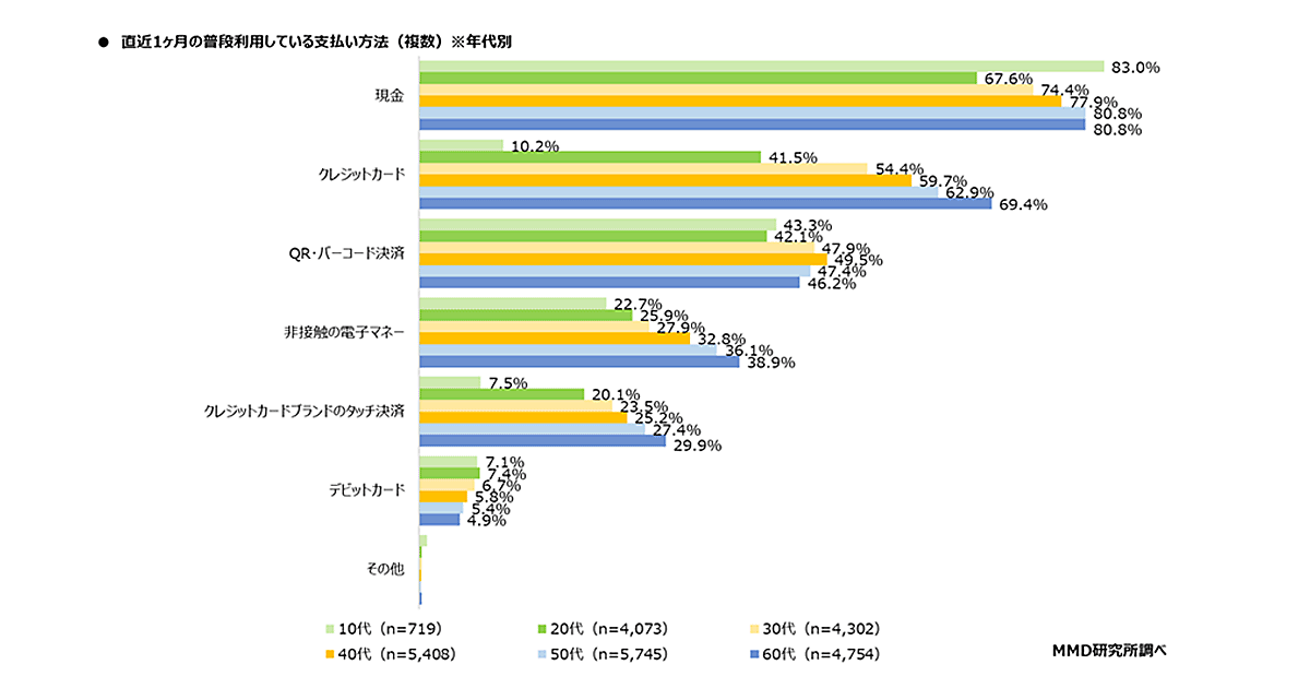 年代別で見ると、「現金」は10代(83.0%)、「クレジットカード」は60代(69.4%)、「QR・バーコード決済」は40代(49.5%)、「非接触の電子マネー」は60代(38.9%)、「クレジットカードブランドのタッチ決済」は60代(29.9%)、「デビットカード」は20代(7.4%)がそれぞれ最多だった。