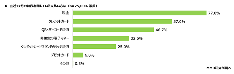 調査対象者に普段利用している支払い方法について、直近1か月の支払い方法の割合を聞いたところ、最多は「現金」(77.0%)で、次いで「クレジットカード」(57.0%)「QR・バーコード決済」(46.7%)だった。