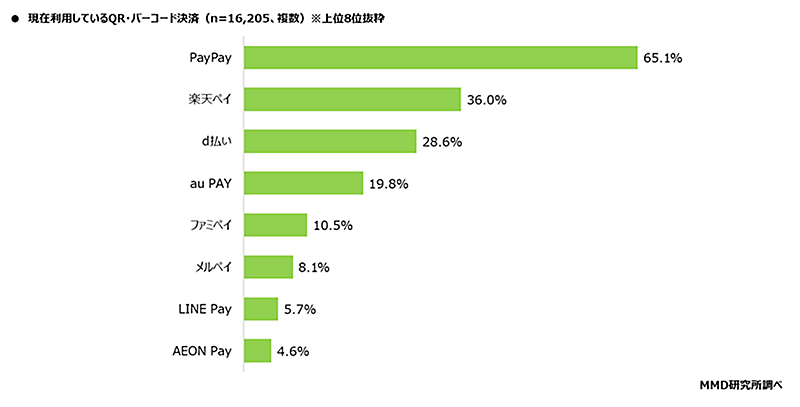 MMDLaboが運営するMMD研究所が実施した「2025年1月決済・金融サービスの利用動向調査」によると、利用しているQRコード決済のトップは「PayPay」で65.1%だった。予備調査は18歳~69歳の男女2万5000人、期間は2025年1月10日~1月14日。