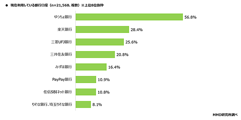利用している銀行口座上位は「ゆうちょ」「楽天」「三菱UFJ」