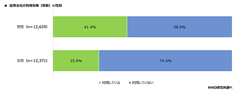 証券会社の利用について聞いたところ、33.6%が「利用している」と回答した。性別で見ると、男性は41.4%、女性は25.6%だった。