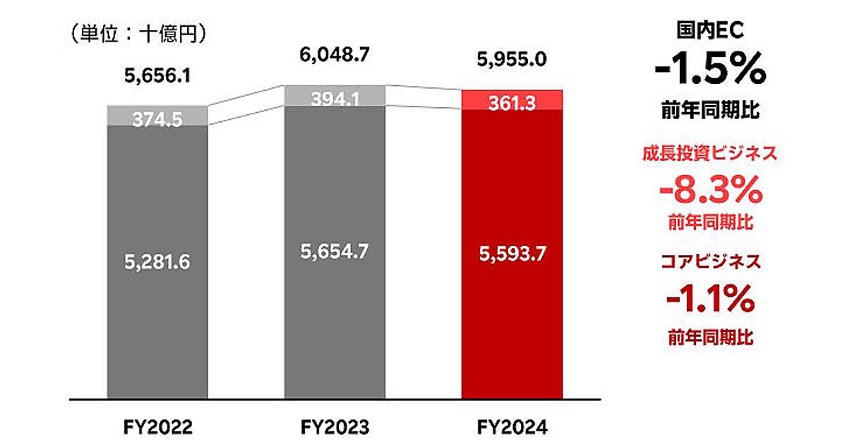 楽天グループの2024年度(2024年1~12月)国内EC流通総額は前期比1.5%減の5兆9550億円だった。