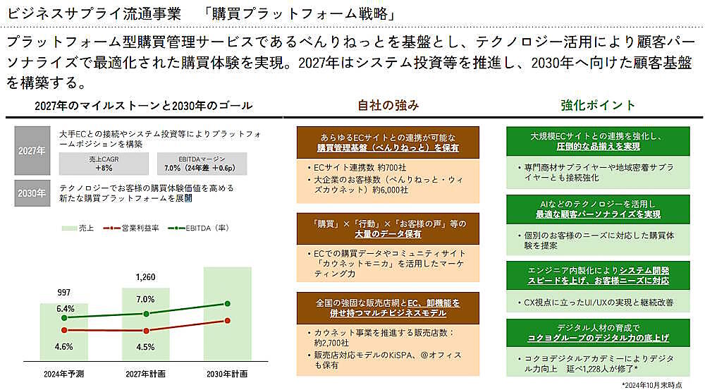 ビジネスサプライ流通事業は、カウネットが運営するプラットフォーム型購買管理サービス「べんりねっと」の基盤を生かし、大規模ECサイトや専門商社などとの接続を強化する方針。2027年までにシステム投資などを推進し、2030年へ向けた顧客基盤を構築する。
