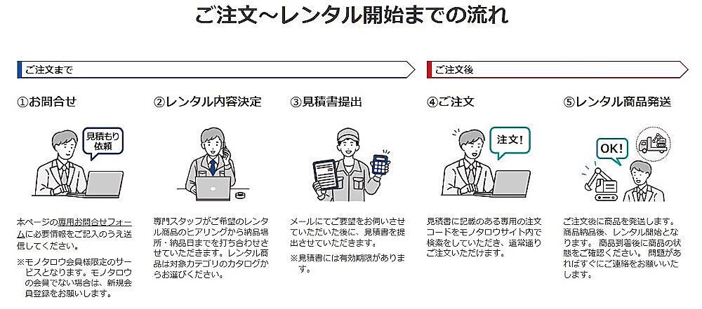 こうした課題を解決し、顧客の生産性向上に貢献するために、MonotaROは他の商品購入と合わせてワンストップで建機を手配できる「建機レンタルサービス」の提供を開始した。サービスの特長は次の通り。