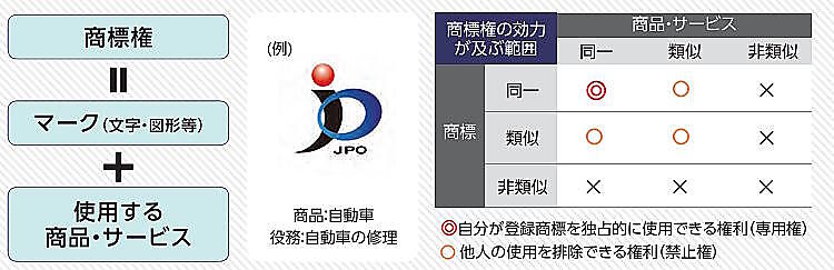 商標権を持っていれば、同じ名前やマークのほか、それに似た(類似した)名前やマークを他社に無断で使用されることを防ぐことができます。ちなみに、文字列や図形だけでなく、音や色、匂いも登録の対象になることがあります。