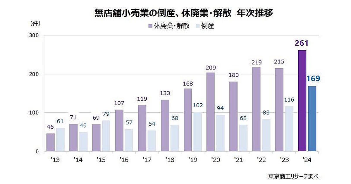 東京商工リサーチの調査によると、2024年における「無店舗小売業」の倒産は169件(前年比45.6%増)で過去最多を記録。休廃業・解散も261件と同21.3%増えた。倒産と休廃業・解散の合計は430件(同29.9%増)で、過去最高の2023年を99件上回った。