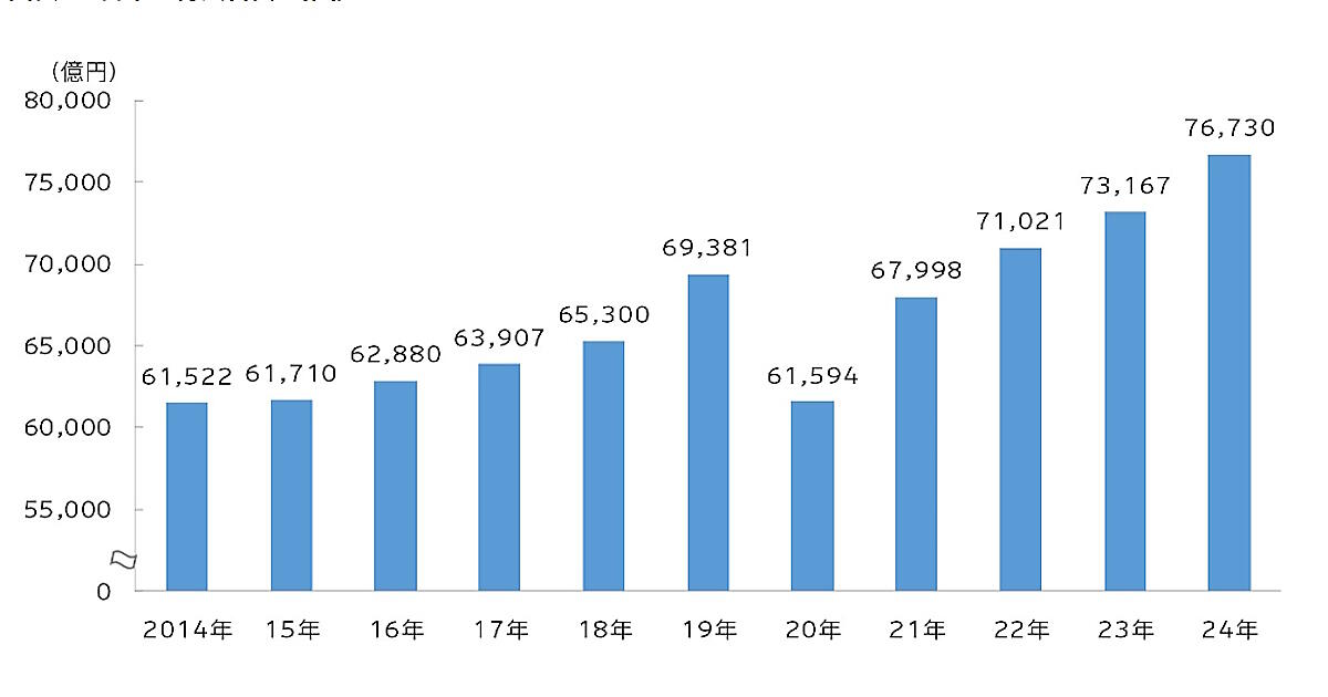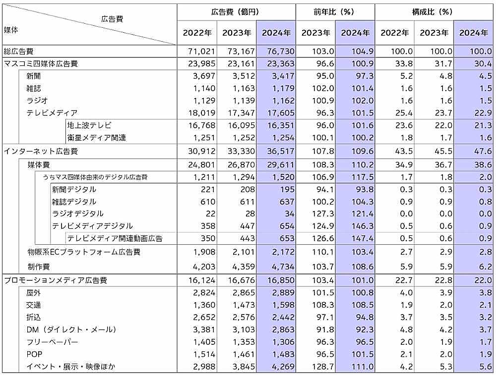 電通が発表した「2024年 日本の広告費」によると、日本の総広告費は7兆6730億円(前年比4.9%増)で、総広告費は2021年から4年連続で成長し、3年連続で過去最高を更新した。