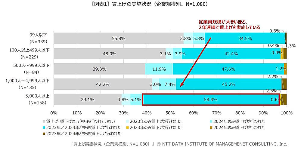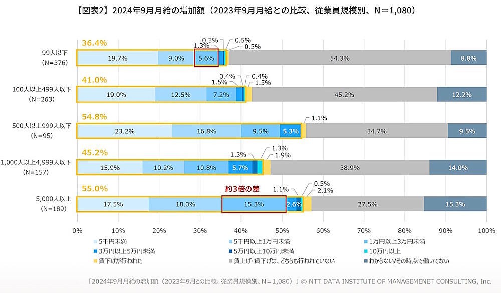 NTTデータ経営研究所が実施した賃上げに関する調査によると、企業規模によって賃上げ実施の有無が二極化していることがわかった。調査期間は2024年11月5日~11月11日で、有効回答数は1080人。