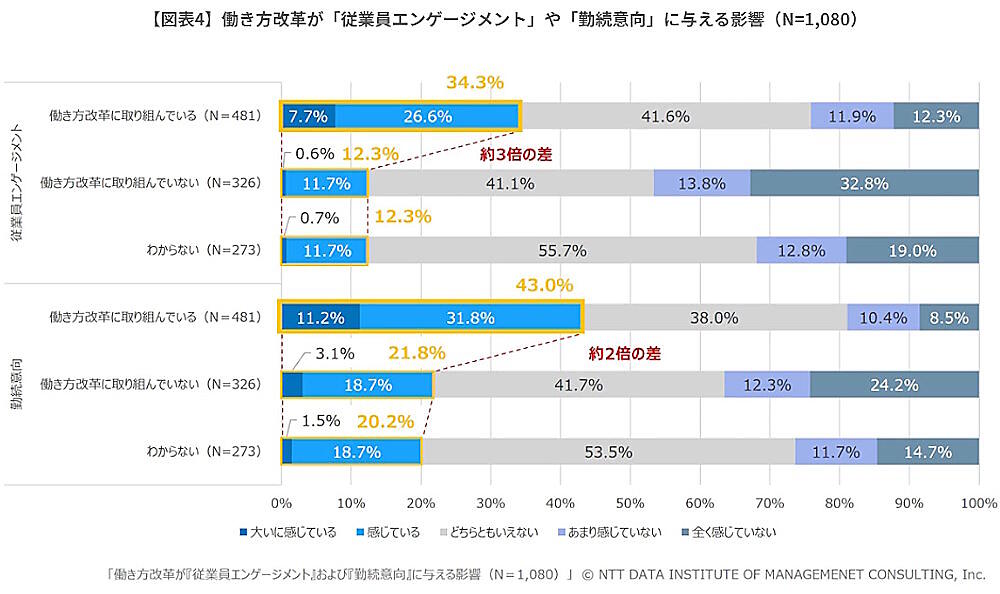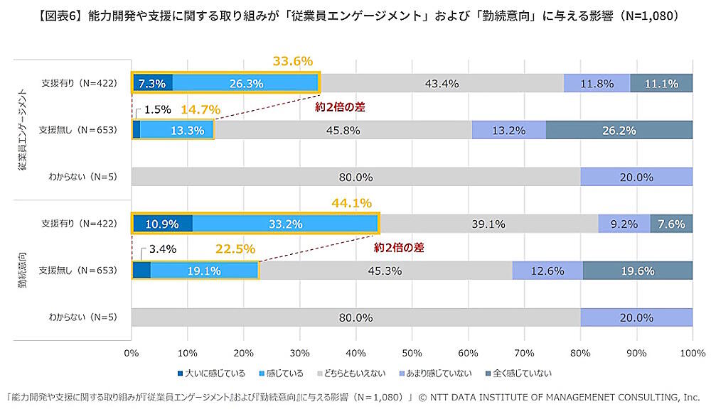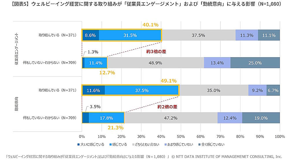 「働き方改革」「ウェルビーイング経営」「能力開発・支援」などの取り組みが、従業員エンゲージメントや勤続意向に与える影響を聞いたところ、これらに取り組んでいる企業は取り組んでいない企業に比べて、従業員エンゲージメントや勤続意向が約2倍から3倍高いことがわかった。