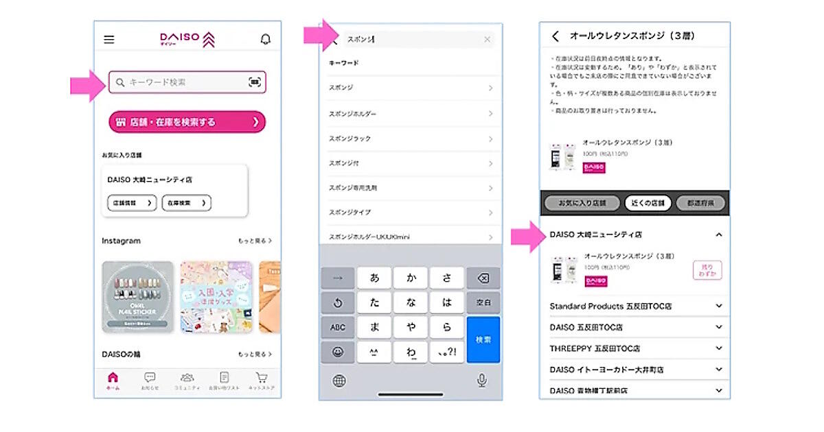商品起点の在庫検索では、店舗を選択してから商品を検索するという従来の検索フローに加え、商品から店舗在庫が検索できるようになった。在庫検索の対象店舗は日本国内の「DAISO」「Standard Products」「THREEPPY」で、約3300店舗・約6万8000商品。一部の店舗は除く。