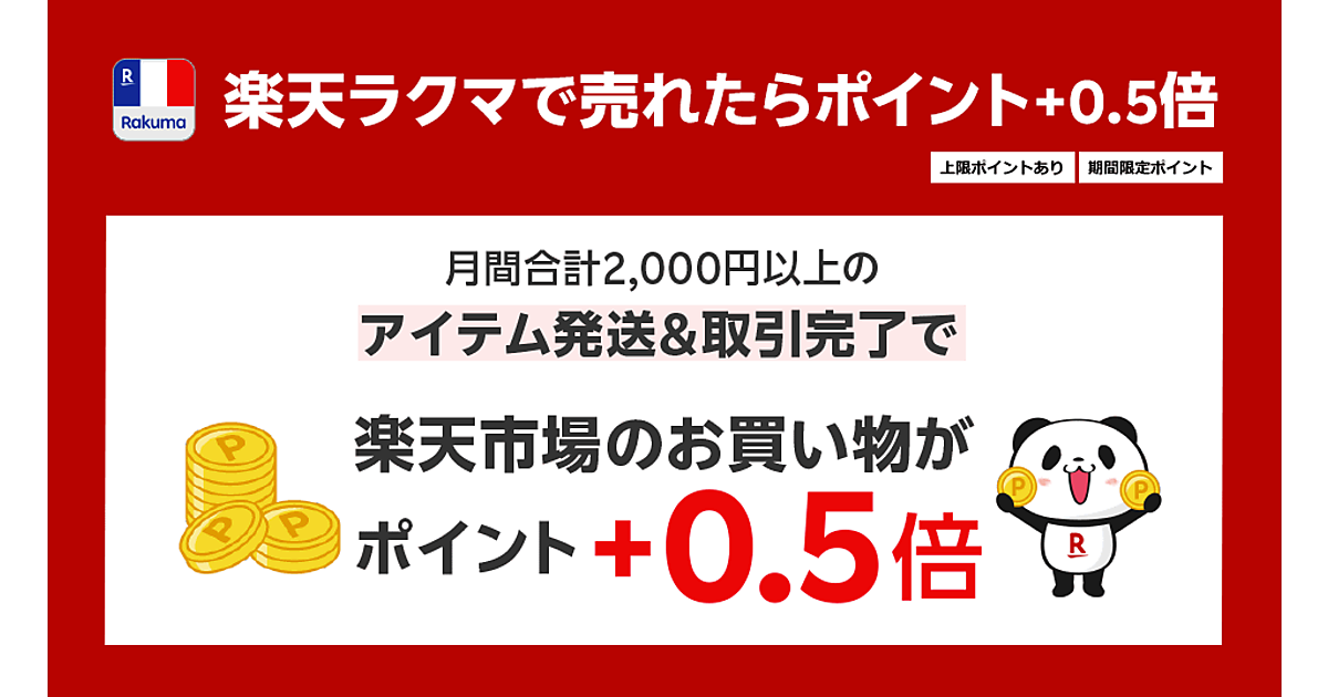 「楽天ラクマ」で月間合計2000円以上の商品を販売して発送および取引完了となったことを条件に、「楽天市場」での商品購入額に対してポイント倍率を+0.5倍加算する。 なお、ポイントの獲得上限は月間500ポイント。
