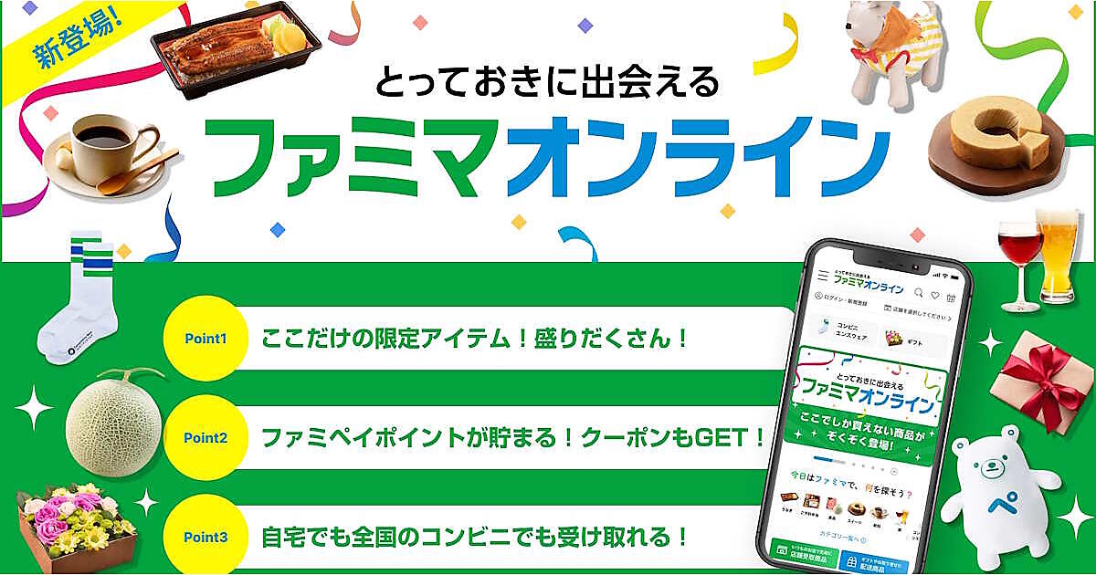 「ファミマオンライン」では、ファミリーマートがこれまでに展開してきた「ファミペイWeb予約」(ネットで注文された商品を、顧客が指定するファミリーマート店舗で受け渡すサービス)や、ギフトサービスを融合・拡張。全国にある約1万6200店舗のサービスとネットワークをかけあわせた新しいオンラインサービスとして提供する。