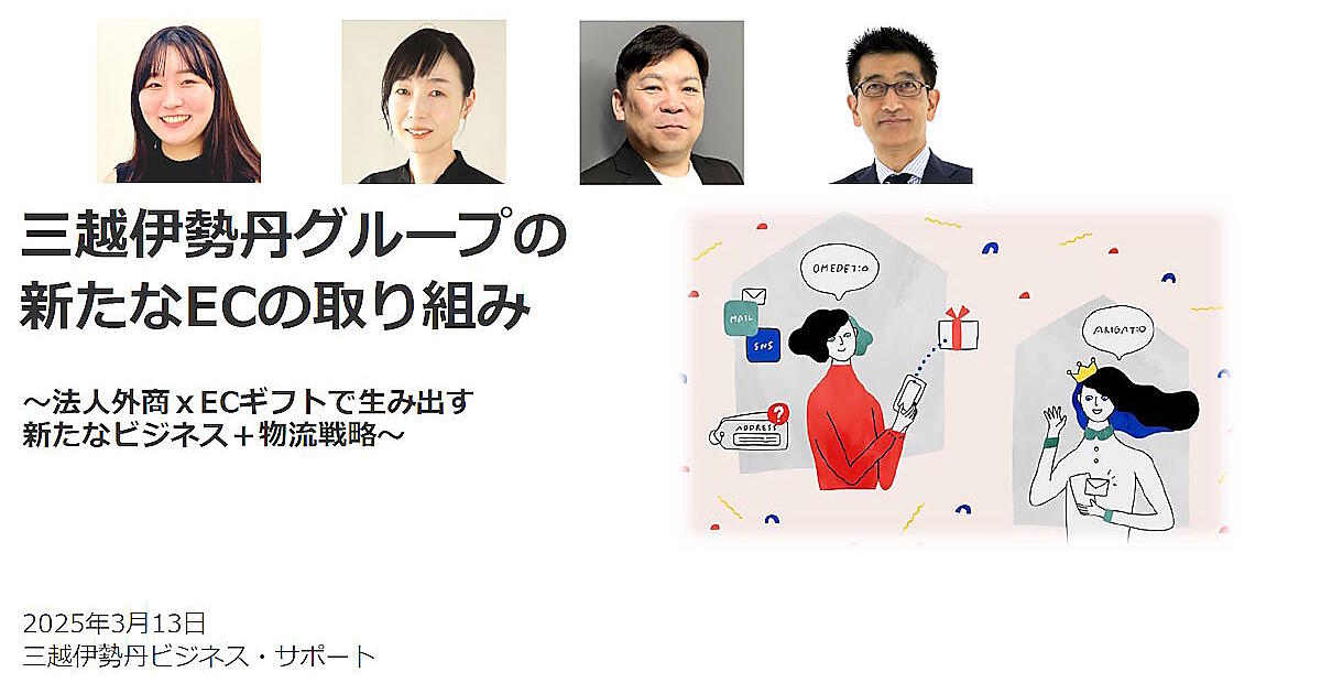 この新たなECの取り組みについて、三越伊勢丹のEC事業の担当者が全体戦略を踏まえて、ECギフト市場、法人外商との連携による新たなビジネスモデルを解説。ギフト発送業務などグループの物流面を担う三越伊勢丹ビジネス・サポートセンターの物流戦略も交え、三越伊勢丹グループの通販・ECの取り組みを解説していきます。