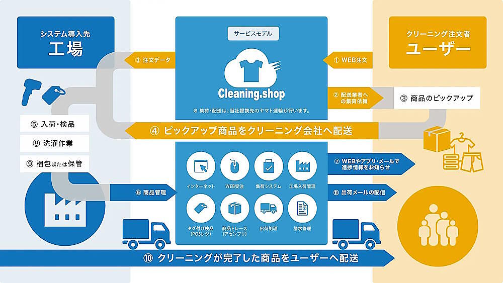 「せんたく便」は受注から納品までをインターネット上で一括提供する宅配クリーニングサービス。また、シャープはヨシハラシステムズが自社開発した宅配クリーニング管理システム「Cleaning.shop」を導入し、受注や集荷といった管理作業を一元化している。
