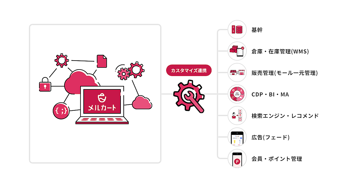 「システム連携開発サービス」は、基幹システムや物流システム、マーケティングツールなどEC周辺システムと「メルカート」を自動連携するために、独自にカスタマイズ連携できるようにする開発サービス。レガシーなシステムや特殊なツールとも接続できるようにし、事業者ごとの連携ニーズに応える。