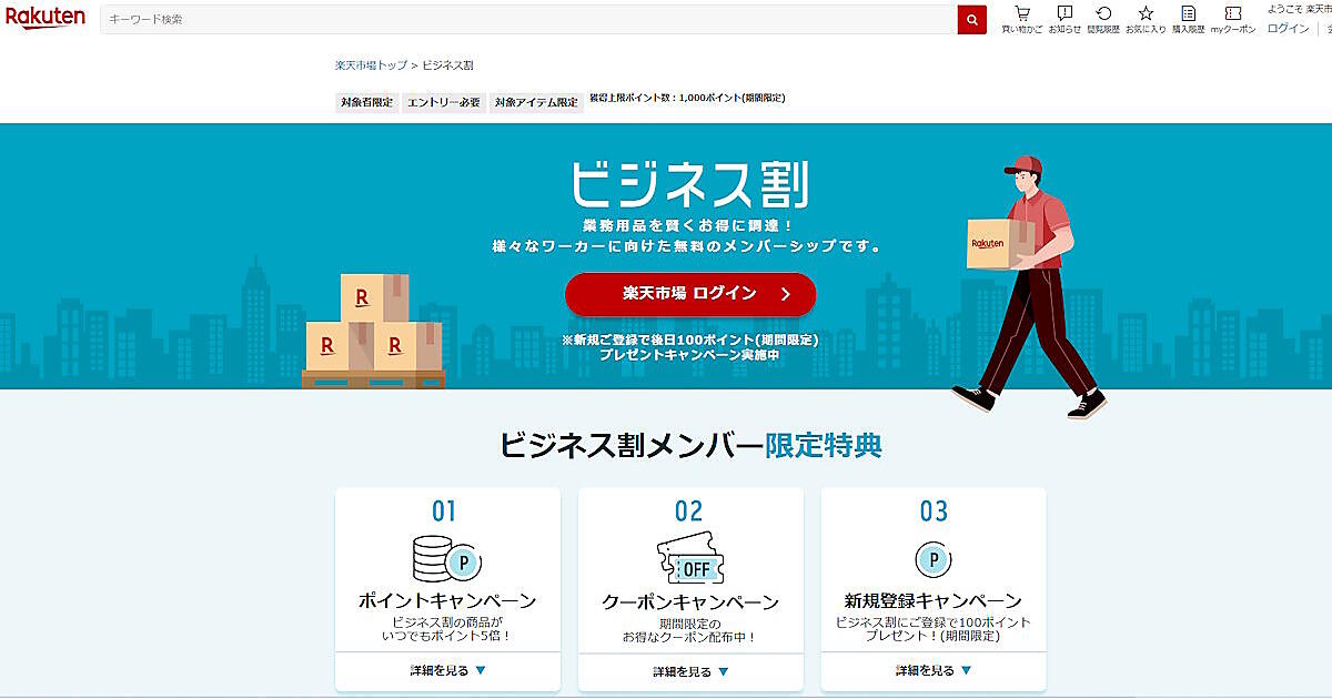 現段階でビジネス割の対象となる「楽天市場」店舗は、オフィス用品・サプライ用品は、楽天が運営する「Business Supply Shop」、衛生・福祉用品は楽天運営の「Pro Lab. & Healthcare Shop」、オフィス家具はネットフォース運営の「LOOKIT」、工具・建設用品は、大都が運営する「DIY FACTORY」の4つとなる。