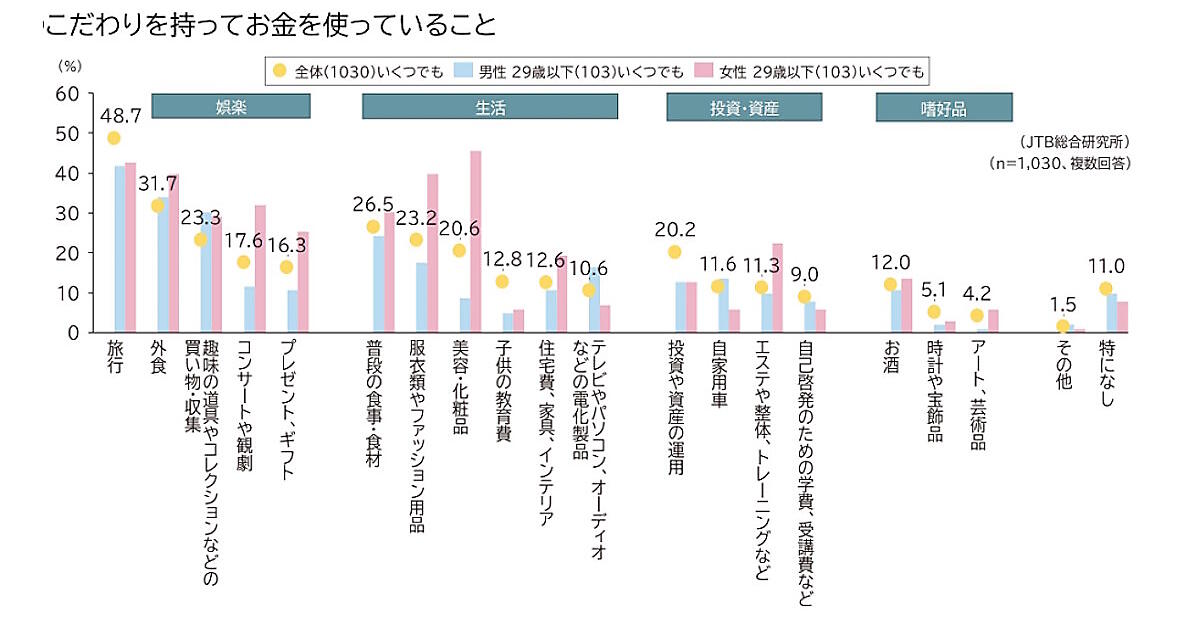 女性29歳以下でも「旅行」が最も多い。「美容・化粧品」が45.6%、「服衣類やファッション用品」が39.8%、「外食」が39.8%、「コンサートや観劇」が32.0%で続いた。