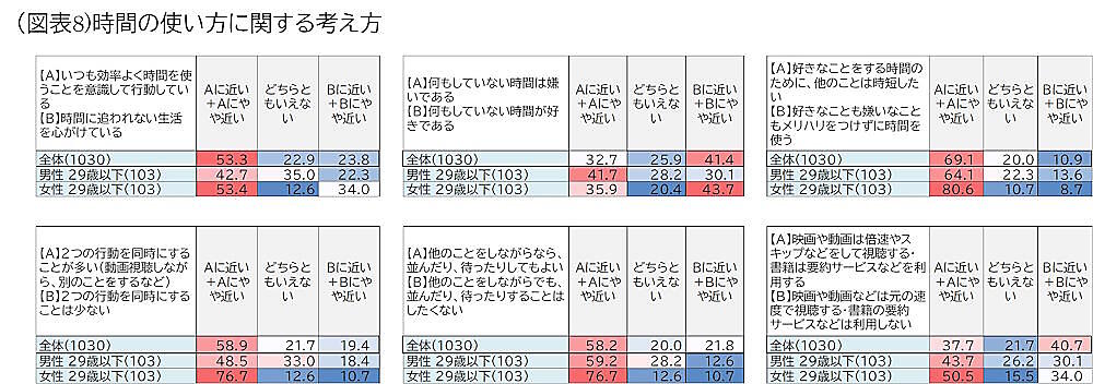 女性29歳以下は「好きなことをする時間のために、他のことは時短したい」が80.6%(同11.5ポイント増)、「2つの行動を同時にすることが多い」が76.7%(同17.8ポイント増)、「他のことをしながらなら、並んだり、待ったりしてもよい」が76.7%(同18.5ポイント増)、「映画や動画は倍速やスキップなどをして視聴する・書籍は要約サービスなどを利用する」が50.5%(同12.8ポイント増)となっており、いずれも全体より高い。