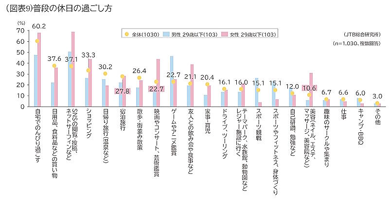 女性29歳以下は「SNSの閲覧・投稿、ネットサーフィンなど」が68.9%で最も高く、続いて「自宅でのんびりと過ごす 」が68.0%、「ショッピング」が43.7%、「映画やコンサート、芸術鑑賞」が43.7%だった。