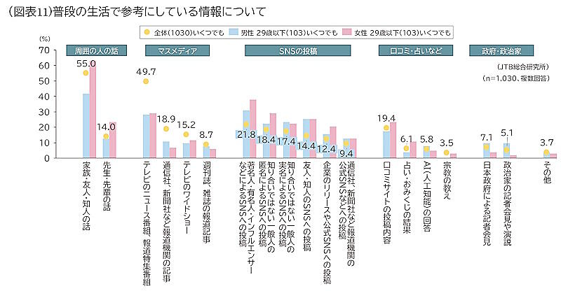 全世代に普段の生活で参考にしている情報について聞いたところ、最も多かったのは「家族・友人・知人の話」で55.0%。続いて「テレビのニュース番組、報道特集番組」が49.7%、「著名人・有名人・インフルエンサーなどによるSNSへの投稿」が21.8%だった。