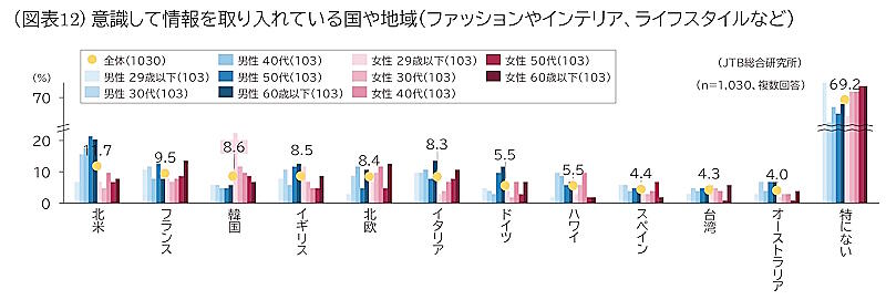 意識して情報を取り入れている国・地域は、男性29歳以下は「特にない」が最も高い74.8%。男性の50歳代・60歳代は北米、女性29歳以下は韓国が高い。
