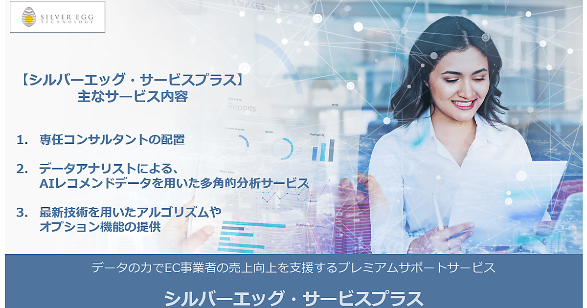 「シルバーエッグ・サービスプラス」は、「アイジェント・レコメンダー」が収集したデータを基に、データアナリストがカスタマイズした分析サービスを提供する。加えて、専任コンサルタントがレコメンドエンジンの活用を軸とした最適な売上向上策を提案。顧客の具体的なニーズに応じたサポートを手がける。