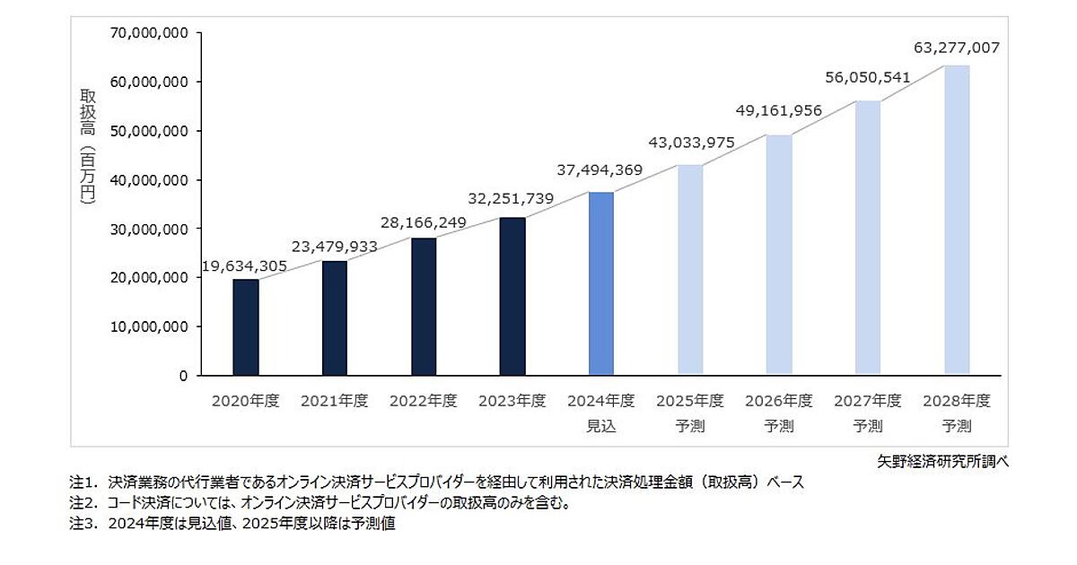 矢野経済研究所が3月27日に公表した国内のオンライン決済サービス市場に関する調査によると、2028年度のオンライン決済サービス国内市場は約63兆円規模まで成長すると予測している。