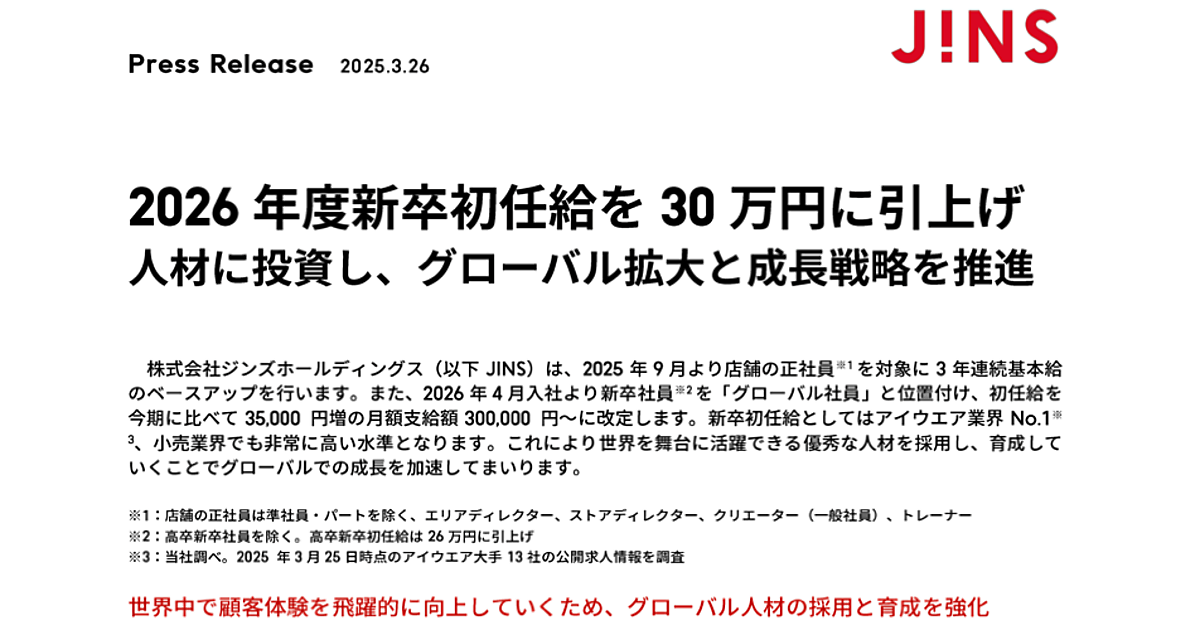 ジンズホールディングスは9月から、店舗の正社員を対象に3年連続基本給のベースアップを実施する。また、2026年4月入社の新卒社員を「グローバル社員」と位置付け、初任給を2025年8月期比で3万5000円増となる月額支給額30万円~に改定する。