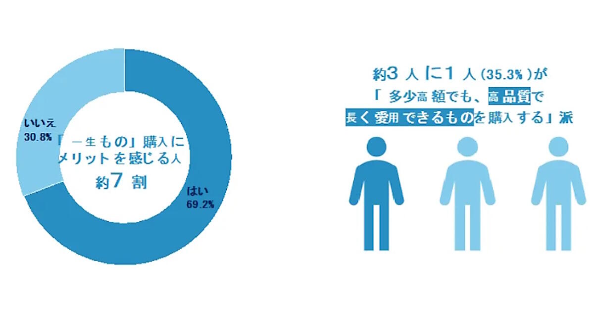 安い商品を頻繁に買い替えるよりも、高価格・高品質な「一生もの」を購入することにメリットを感じるかを聞いたところ、69.2%が「はい」と回答。約7割が「一生もの」の購入に価値を見出していることがわかった。