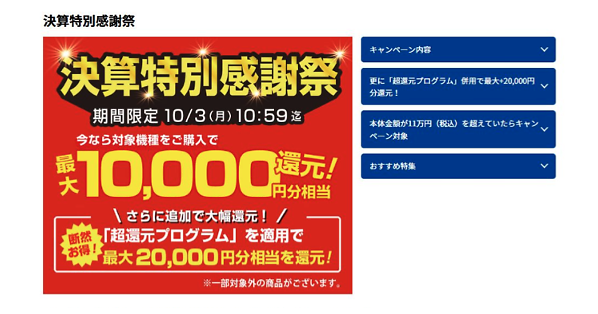 実際はその表示された期間以外にも「冬のボーナス先取還元フェア」「2023スタートダッシュ還元祭」「決算クリアランス還元祭」「決算全力還元祭」「GWを楽しもう!ウルトラ還元祭」「超パソコン還元フェア」「ボーナス先取り還元フェア」「超ボーナス還元祭」などと、1年弱に渡って断続的に同様またはより有利な内容で還元などを実施していた。