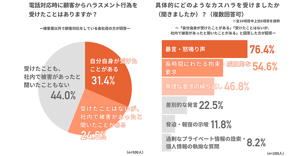 「自分自身が受けたことがある」が31.4%、「受けたことはないが、社内で被害があったと聞いたことがある」が24.6%だった。電話対応時に、約3割が直接カスハラを経験し、社内での報告を含めると過半数がカスハラの事例を認識していることが明らかになった。