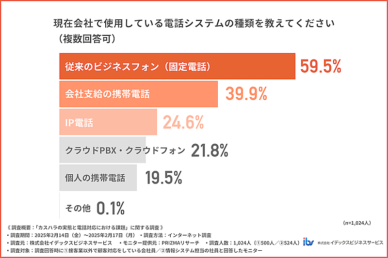 「従来のビジネスフォン」の回答が59.5%と最多。「会社支給の携帯電話」(39.9%)「IP電話」(24.6%)が続いた。「従来のビジネスフォン」を利用する企業が多い一方で、「会社支給の携帯電話」や「IP電話」の導入も進みつつあることがわかった。