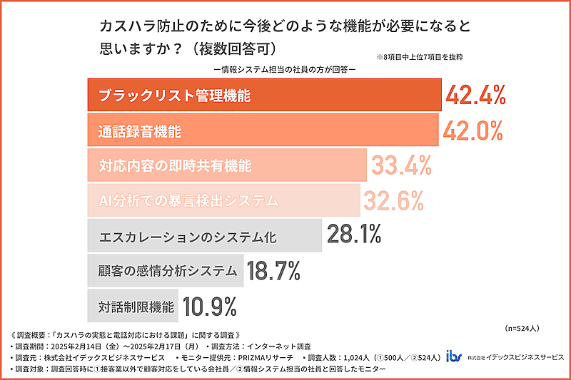イデックスビジネスサービスでは、調査を通じて「今後のカスハラ防止策としては、通話録音機能や対応内容の即時共有機能、AI分析による暴言検出システムといった機能が求められており、客観的な証拠を残すシステムの導入が重要である」と総括。「企業がカスハラ対策を強化するためには、従業員の精神的負担を軽減する仕組みを整えるとともに、情報システムを活用した効果的な対応策を検討することが求められる」と指摘した。