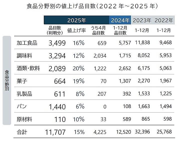 2025年の年間累計の値上げは9月までの公表分で1万1707品目となり、すでに前年実績の9割を超え、通年で2万品目前後に到達すると見られている。