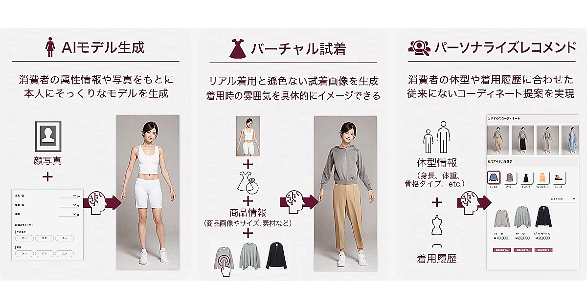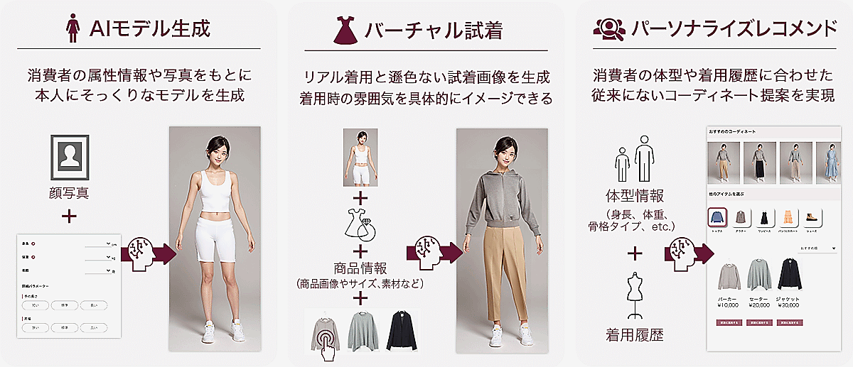 ECサイトに掲載している商品画像と着丈・袖丈などのサイズ情報を連携するだけで、消費者の特長を反映したAIモデルがリアルタイム生成できる。新たにデータを準備する必要はないとしている。