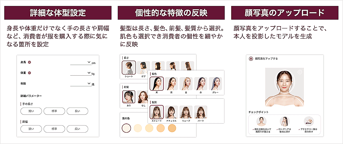 消費者が入力した自身の体型や髪型などから、パーソナライズモデルをAIでリアルタイム生成。また、自身の顔写真をアップロードすることで、本人の顔を反映させたモデルを作成できる。これらの機能により、消費者自身にそっくりなパーソナライズモデルがバーチャル上で試着する。