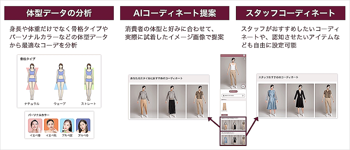 また、従来はECサイト上に掲載している組み合わせ済みのコーディネート画像しか確認できなかったが、「MIM」は消費者自身の特長やイメージに合った好みの商品を選択し、自由な組み合わせによる全身コーディネートの確認ができる。