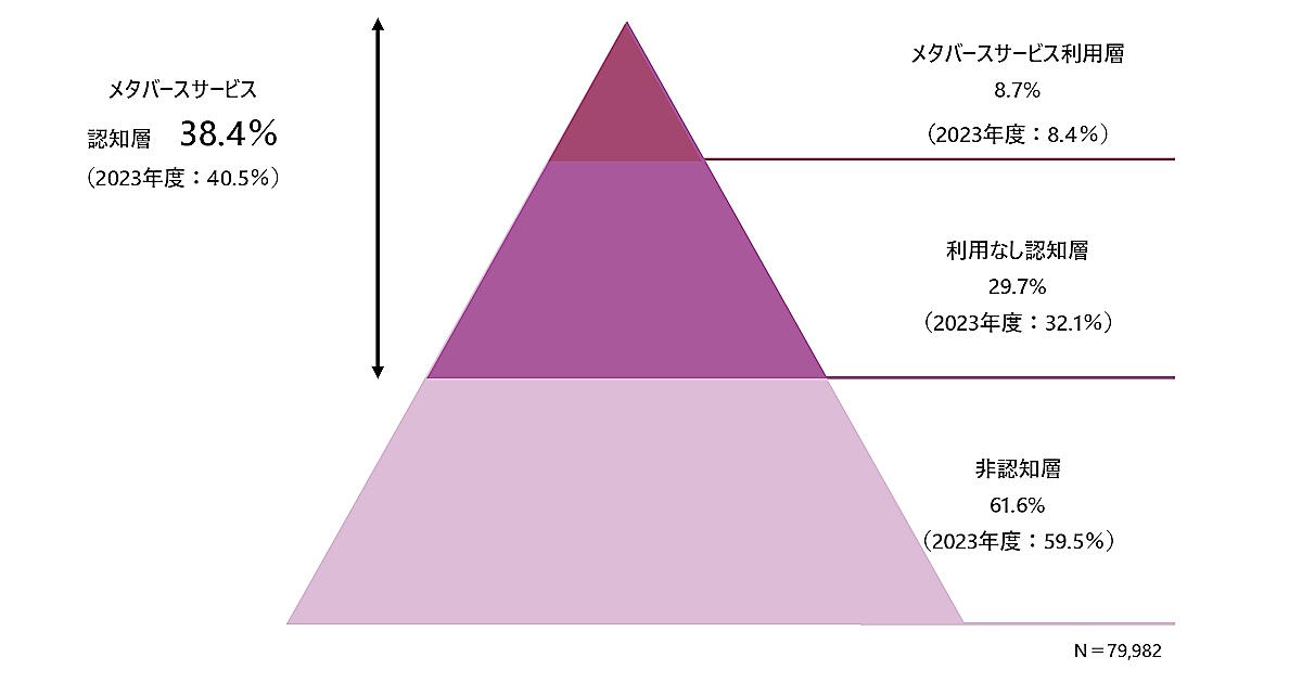 国内でメタバース関連のサービスを認知している割合は「メタバースサービス利用層」「利用なし認知層」を合わせて38.4%となり、推計約3294万人だった。前回調査の2023年はメタバースの認知率が40.5%で、2.1ポイント減少している。