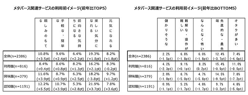 「オタクが多い」は7.4%(同4.0ポイント減)、「先進的な・最先端」は12.4%(同3.7ポイント減)といった回答は前回調査よりも減少しており、メタバースへの親和的イメージが増加している。
