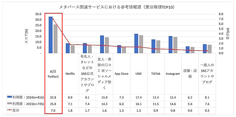 利用層のメタバース関連サービスの参考情報源は「X」が32.8%(同7.0ポイント増)。次いで「LINE」が17.4%(同1.3ポイント増)、「Instagram」が15.4%(同0.8ポイント増)だった。